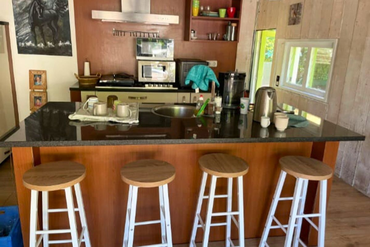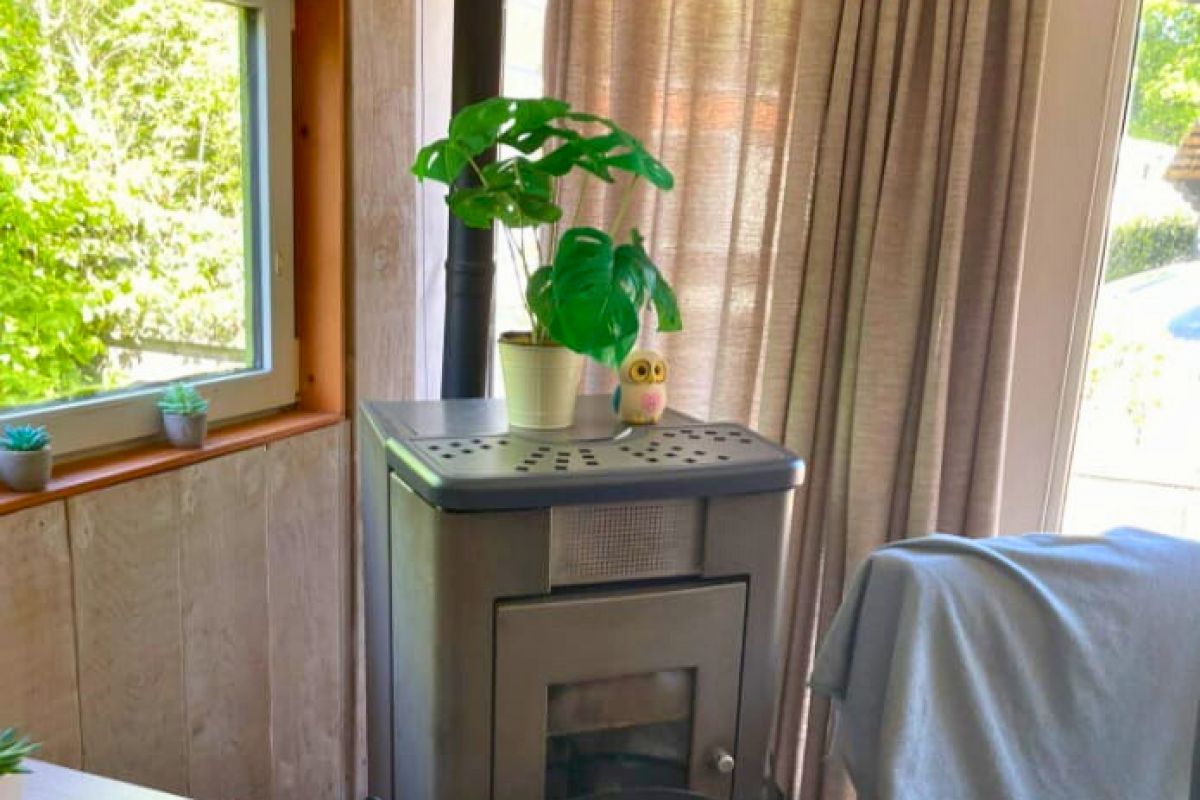 Het chalet is voorzien van een volledige, open keuken met kookeiland, koelkast en vrieskast. Verder is er een wasmachine, warmtepomp en een pelletkachel met aangekoppelde CV.