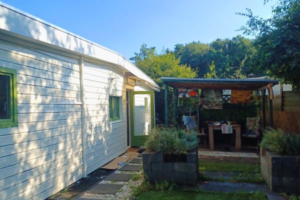 Het chalet is 10 m bij 4.70 met rondom een tuin. Achter het chalet is er een afdak in gebruik als schuur. Verder is er in de tuin een afdak, met daaronder plaats voor een loungeset, zodat in de schaduw gezeten kan worden.
